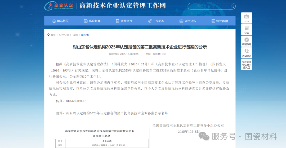 12月8日,全国高新技术企业认定管理工作领导小组办公室发布《对山东省认定机构2025年认定报备的第二批高新技术企业进行备案的公示》,国瓷材料全资子公司迈谱新材料技术(山东)有限公司成功通过高新技术企业认定,正式跻身国家高新技术企业之列。 国家高新技术企业作为我国科技创新领域的最高荣誉之一,由科技部、财政部、国家税务总局联合组织实施,其认定标准涵盖核心自主知识产权、研发投入强度、科技成果转化能力、科技人员占比等多个维度,是衡量企业科技创新水平的“金标准”。迈谱公司此次历经企业自评、形式审查、专家技术评审、税务合规核查四大关键环节成功入选,代表着国家层面从技术创新能力、产业发展方向、核心竞争力三个核心维度对迈谱公司创新发展模式和高质量发展潜力的权威认可。 这是迈谱公司2022年12月成立以来荣获的首个国家级荣誉资质,标志着企业科技创新实力获得国家权威认可,正式迈入高质量发展的全新阶段。公司始终将研发创新放在发展首位,组建了由行业资深专家领衔的研发团队,建立了标准化的研发实验室和完善的成果转化机制,在新型功能陶瓷材料评价领域累计突破多项关键技术,形成了一系列具有自主知识产权的核心技术服务,凭借稳定的性能和优质的服务赢得了市场广泛认可。 未来,迈谱公司将以此为契机,精准对接产业升级需求,进一步加大研发投入力度,深化产学研合作,加速科技成果转化,持续提升核心竞争力,为推动行业技术进步、助力实体经济高质量发展注入新动能。